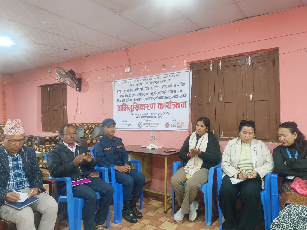मकवानपुर । मकवानपुरको विकट क्षेत्र राक्सिराङ गाउँपालिकामा बालविवाह तथा परम्परागत कु–संस्कृति अन्त्य गर्न शिक्षाको भूमिकामाथि आधारित अभिमुखिकरण कार्यक्रम सम्पन्न भएको छ। “प्रविधिको सही प्रयोग गरौँ : लैङ्गिक हिंसा अन्त्य गरौँ” भन्ने नाराका साथ लैङ्गिक हिंसा विरुद्धको १६ दिने अभियान अन्तर्गत कार्यक्रम आयोजना गरिएको हो।