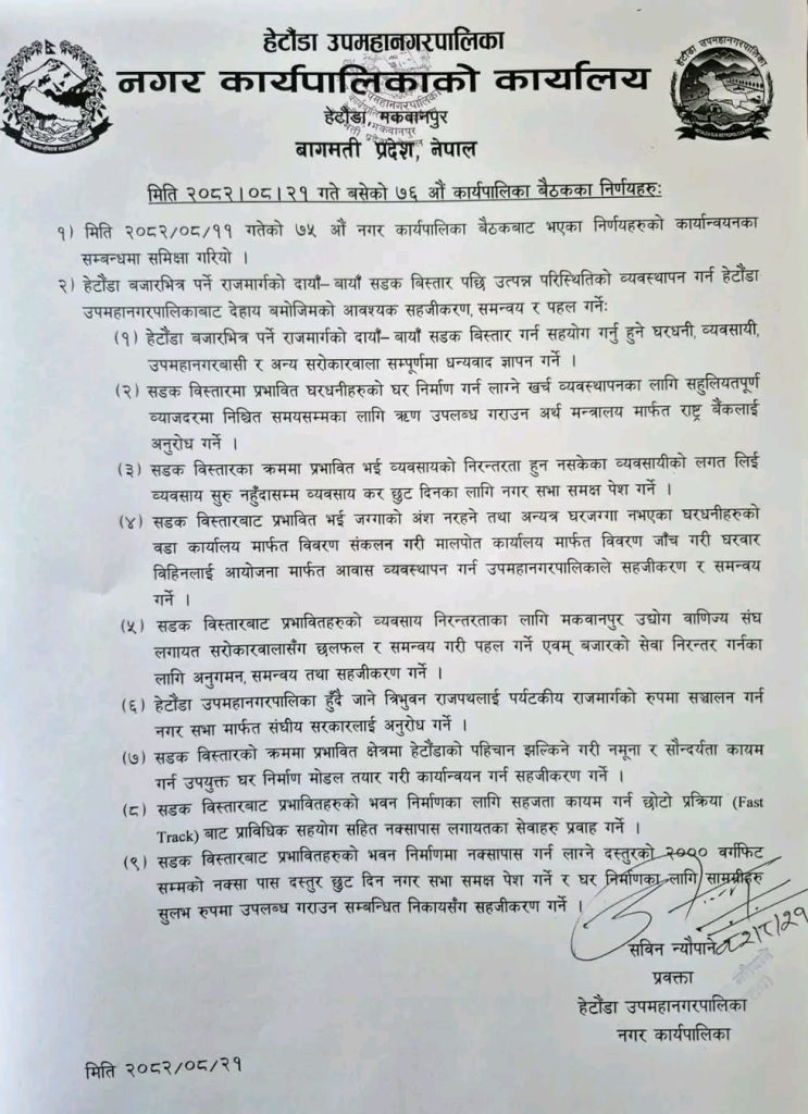 आइतबार बसेको ७६औँ नगर कार्यपालिका बैठकले सडक विस्तारपछि देखा पर्ने समस्याहरू समाधानका लागि ९ बुँदे कार्ययोजना पारित गरेको हो।