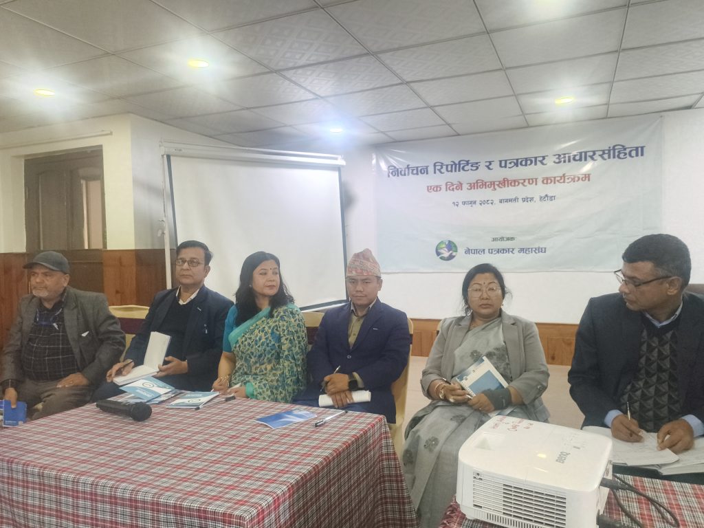 हेटौंडा। नेपाल पत्रकार महासंघको आयोजनामा हेटौंडामा निर्वाचन रिपोर्टिङ तथा पत्रकार आचारसंहितासम्बन्धी एक दिने अभिमुखीकरण कार्यक्रम सम्पन्न भएको छ। आगामी निर्वाचनलाई लक्षित गर्दै आयोजित कार्यक्रममा सञ्चारकर्मीहरूलाई जिम्मेवार र मर्यादित पत्रकारिताका विषयमा प्रशिक्षण दिइएको थियो।
